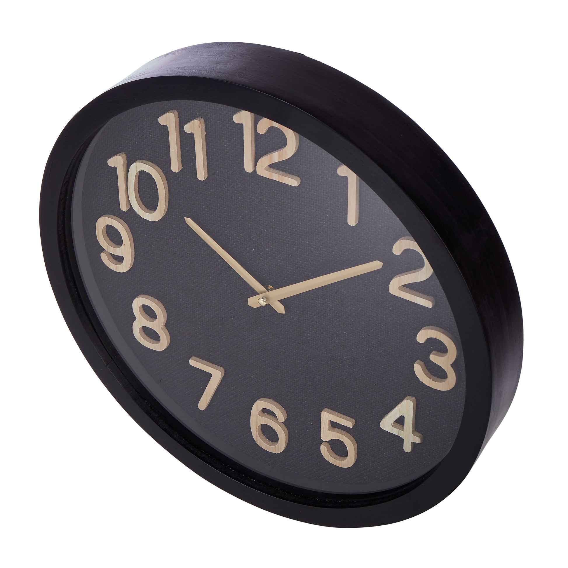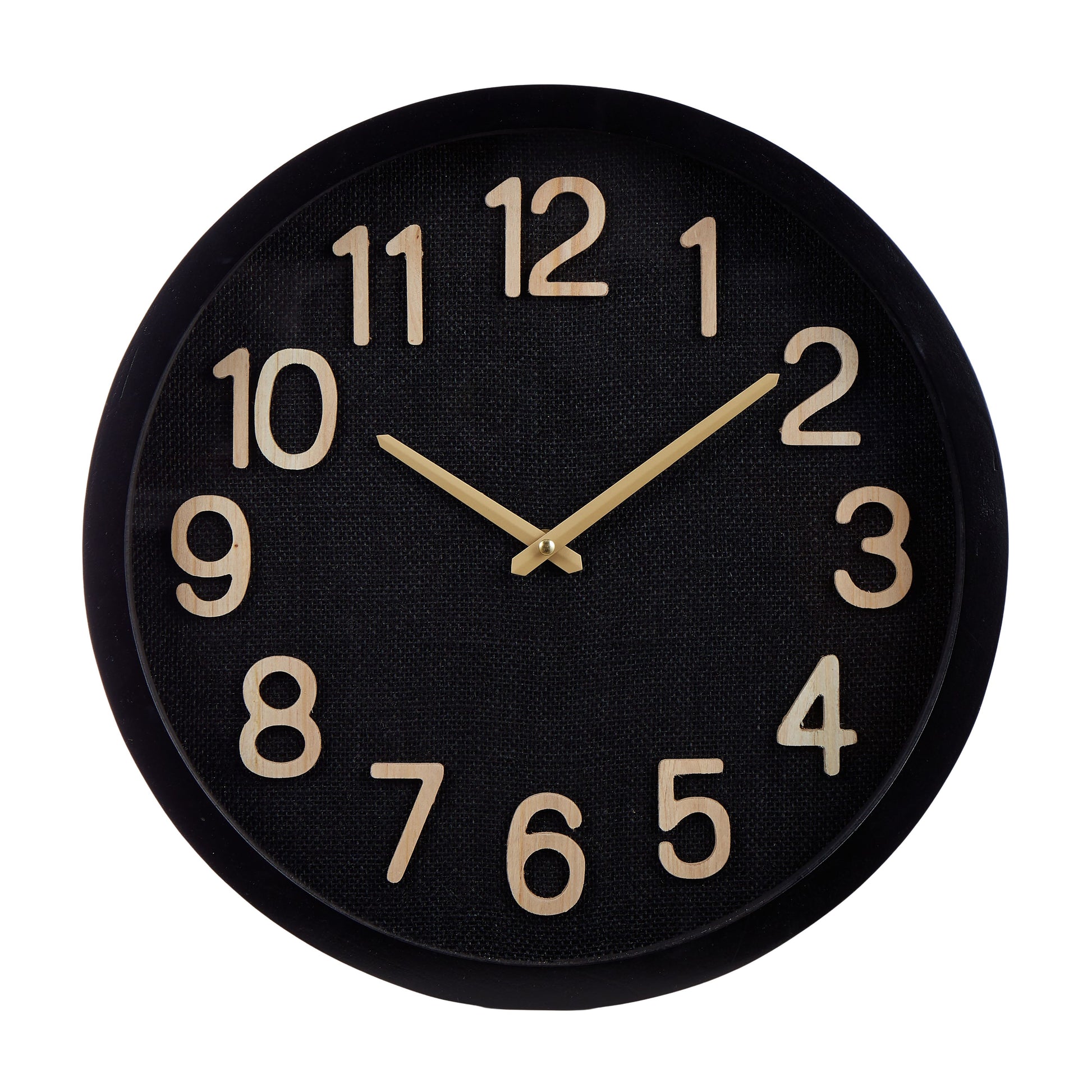 It features a woven black linen dial with wooden numbers in a black glass frame.