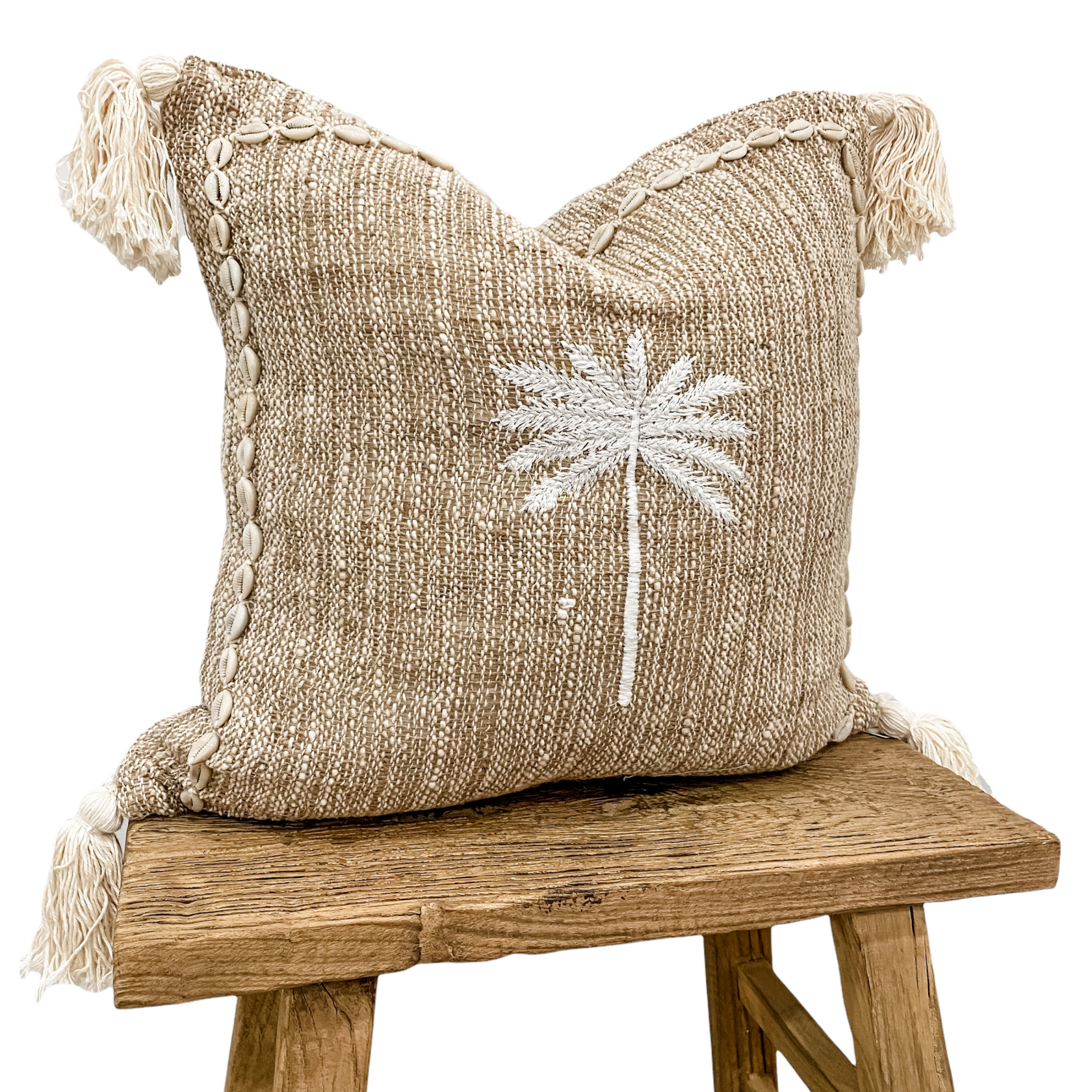 Covers are the perfect Coastal Boho accessory. Made on a textured slub cotton and jute base in a muted tone, with palm embroidery, cowrie shell border, and four tassels adorning each of the corners.