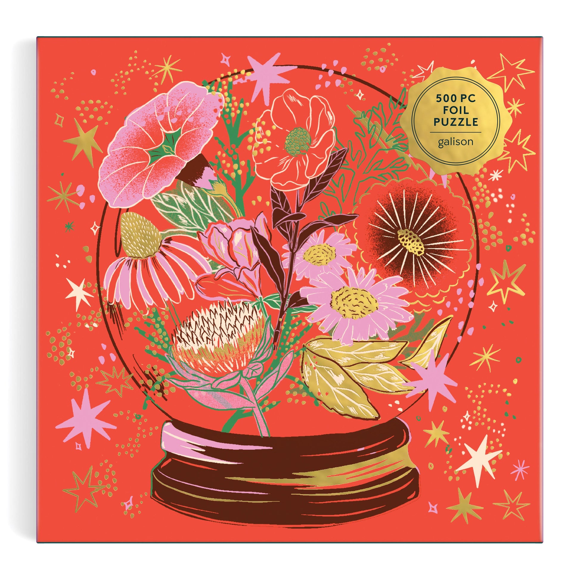 Crystal Flower Ball 500 Piece Foil Puzzle by Galison features an intergalactic world of blooms within a crystal ball enhanced with sparkling gold foil details.