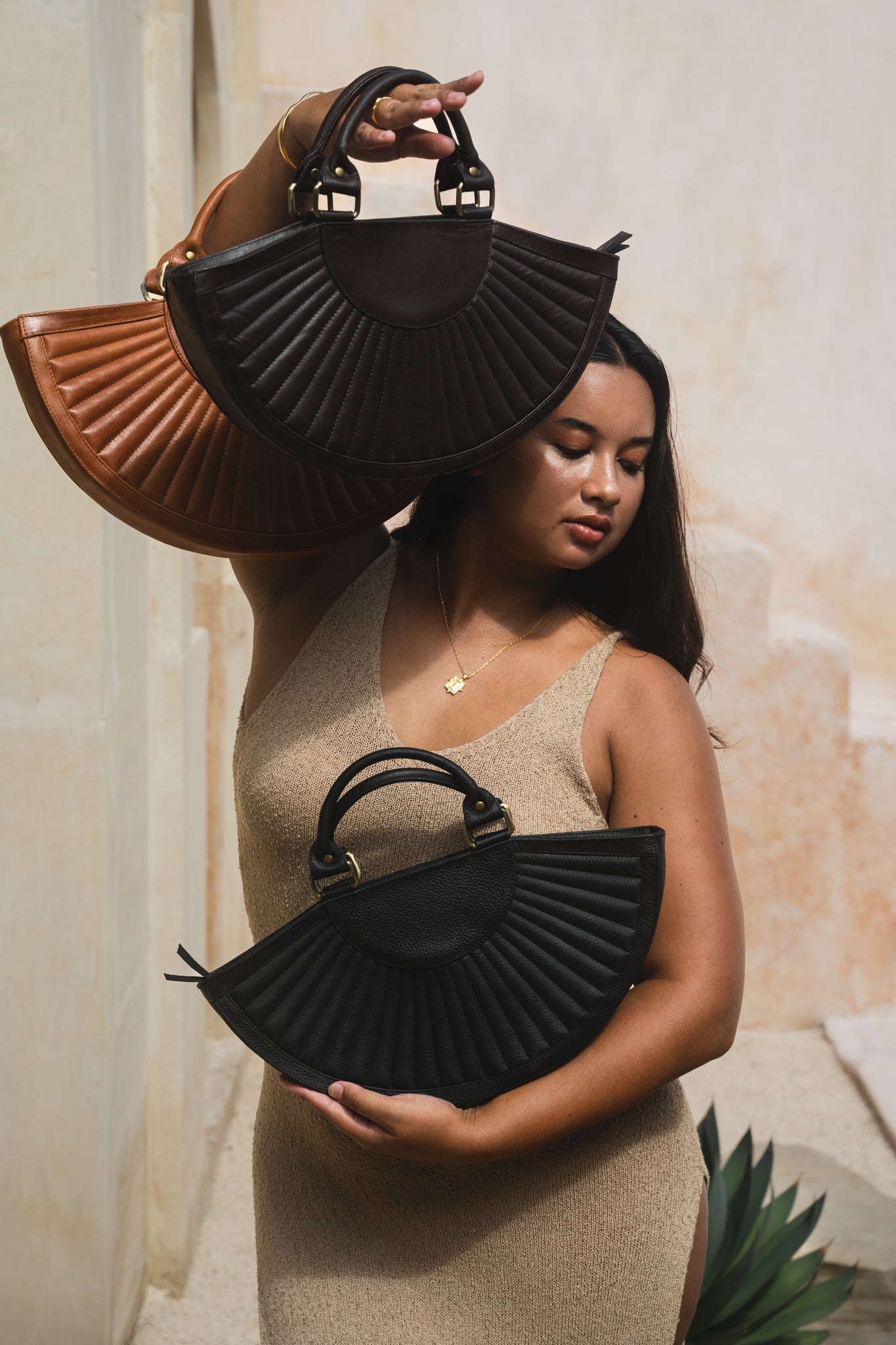 Introducing Soleil Grande, a statement bag designed to capture the grandeur and beauty of the sun. Inspired by the shape of a rising sun, this elegant bag features striking sun ray stitching that radiates from the central panel, creating a bold yet sophisticated design.