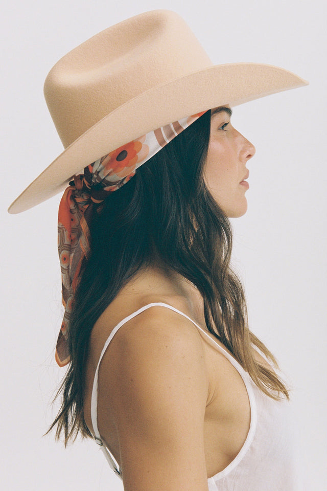 Sunset tones and retro florals collide in the Solar Groove Scarf. With so many ways to style this versatile accessory – from a waist tie, bandanna style or wear it with, on, or under your hat.