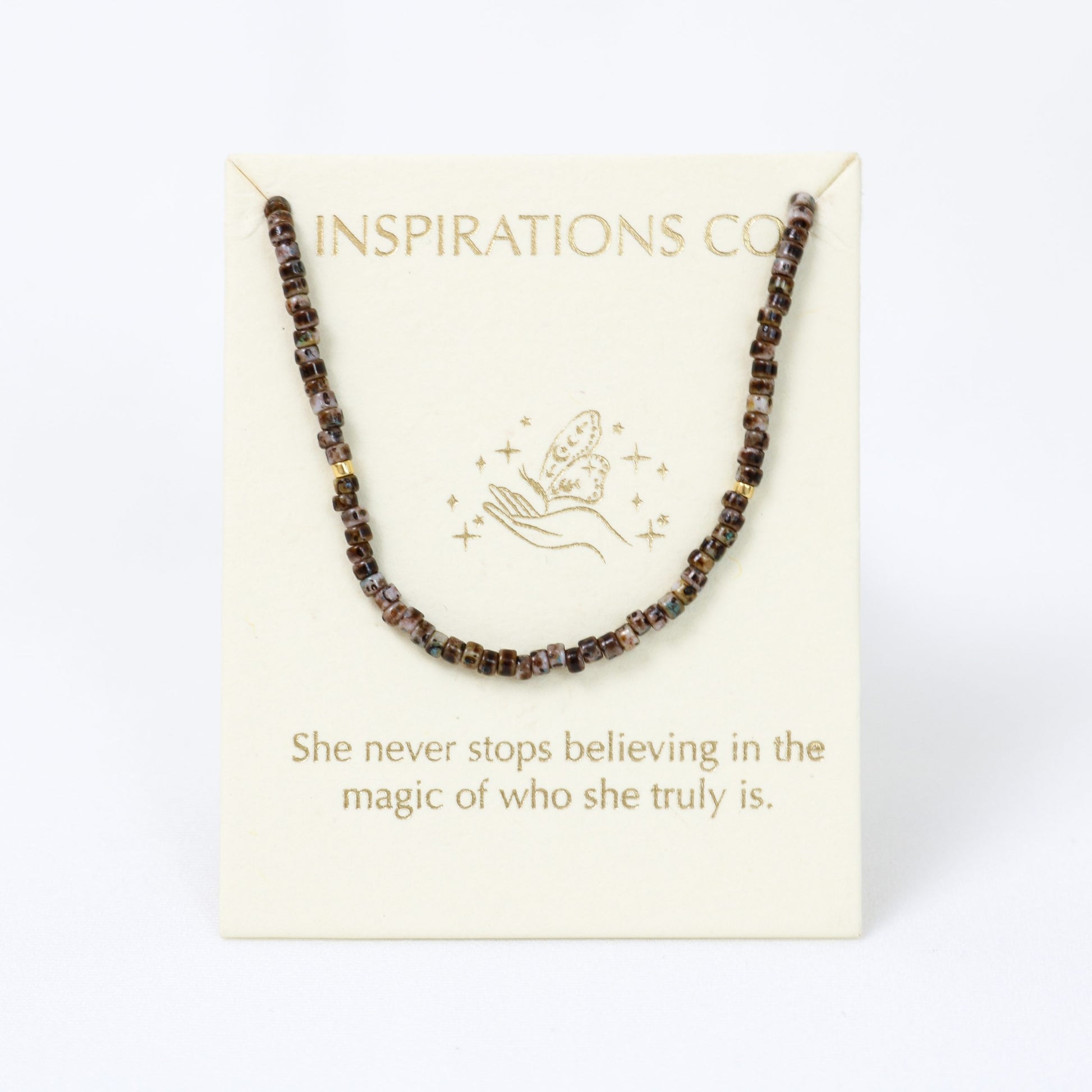 Made with Japanese glass beads and featuring a tarnish free Stainless Steel adjuster chain our Inspiration Necklaces come in an assortment of colours and designs.