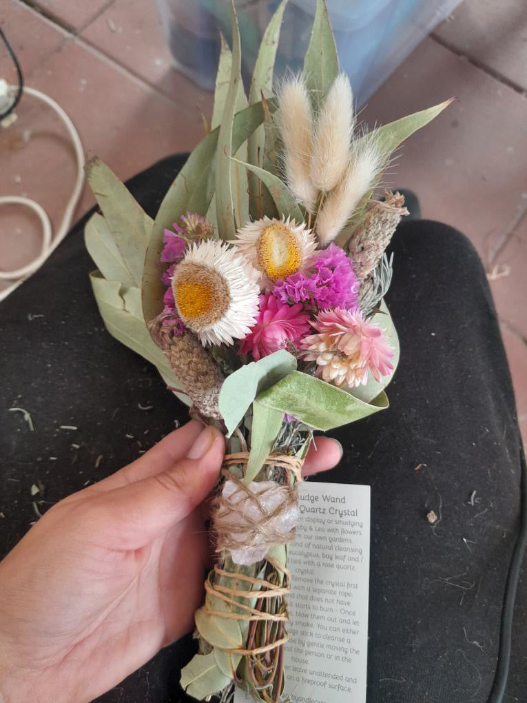 This gorgeous smudge stick is made with rose and sage and has a beautiful piece of rose quartz tied with it.