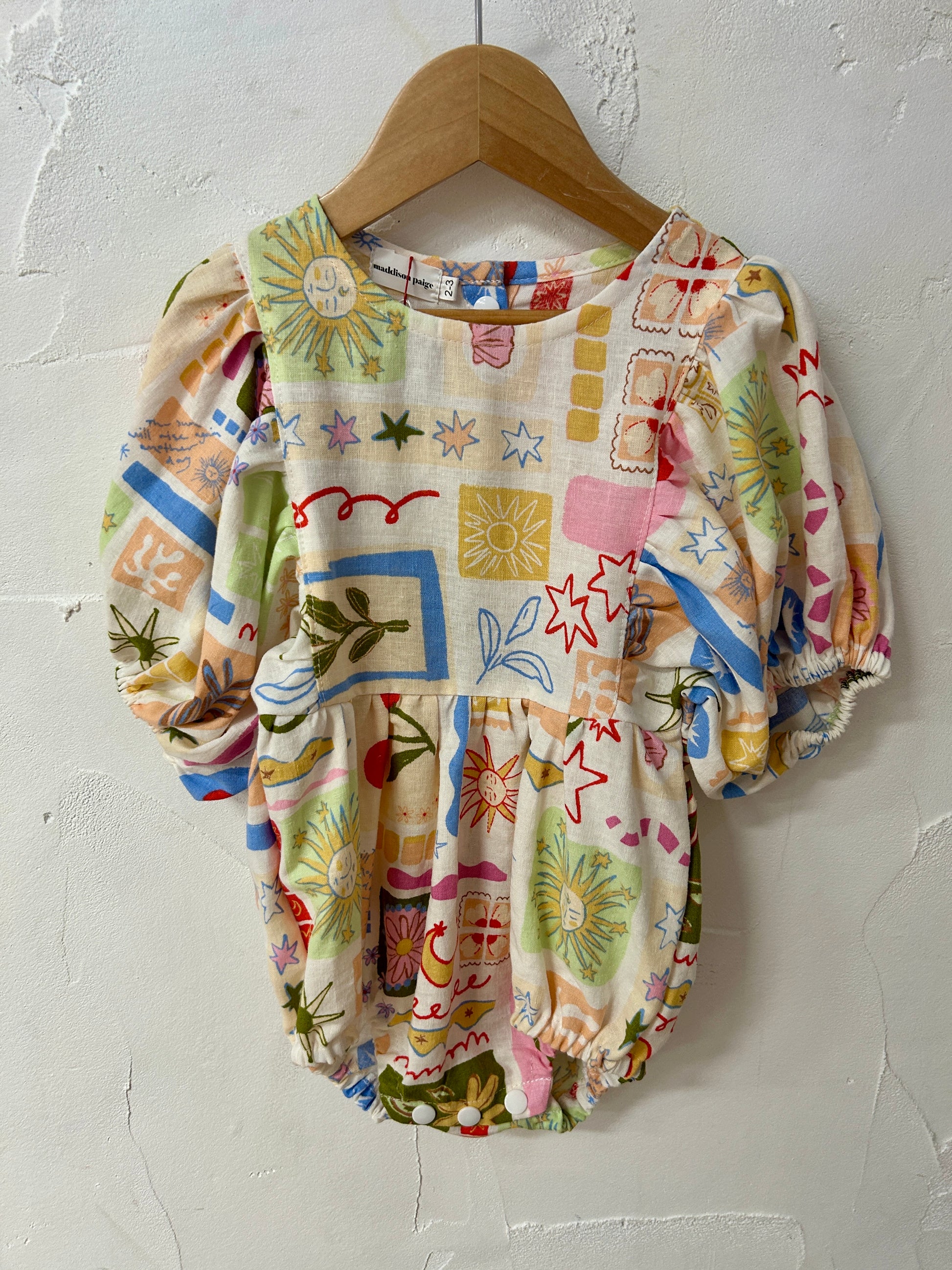 - Puff sleeve style with snap fasteners in back and crotch