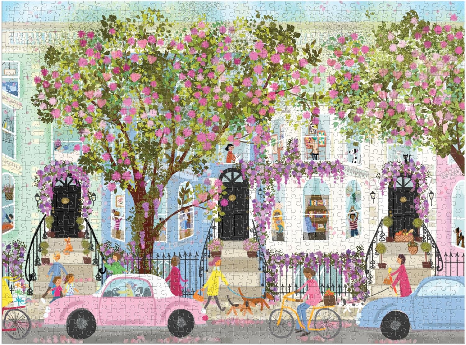 Bestselling artist Joy Laforme expertly applies her unique sense of color, texture, and whimsy to a magnolia-filled residential block on the Spring Terrace 1000 Piece Puzzle.