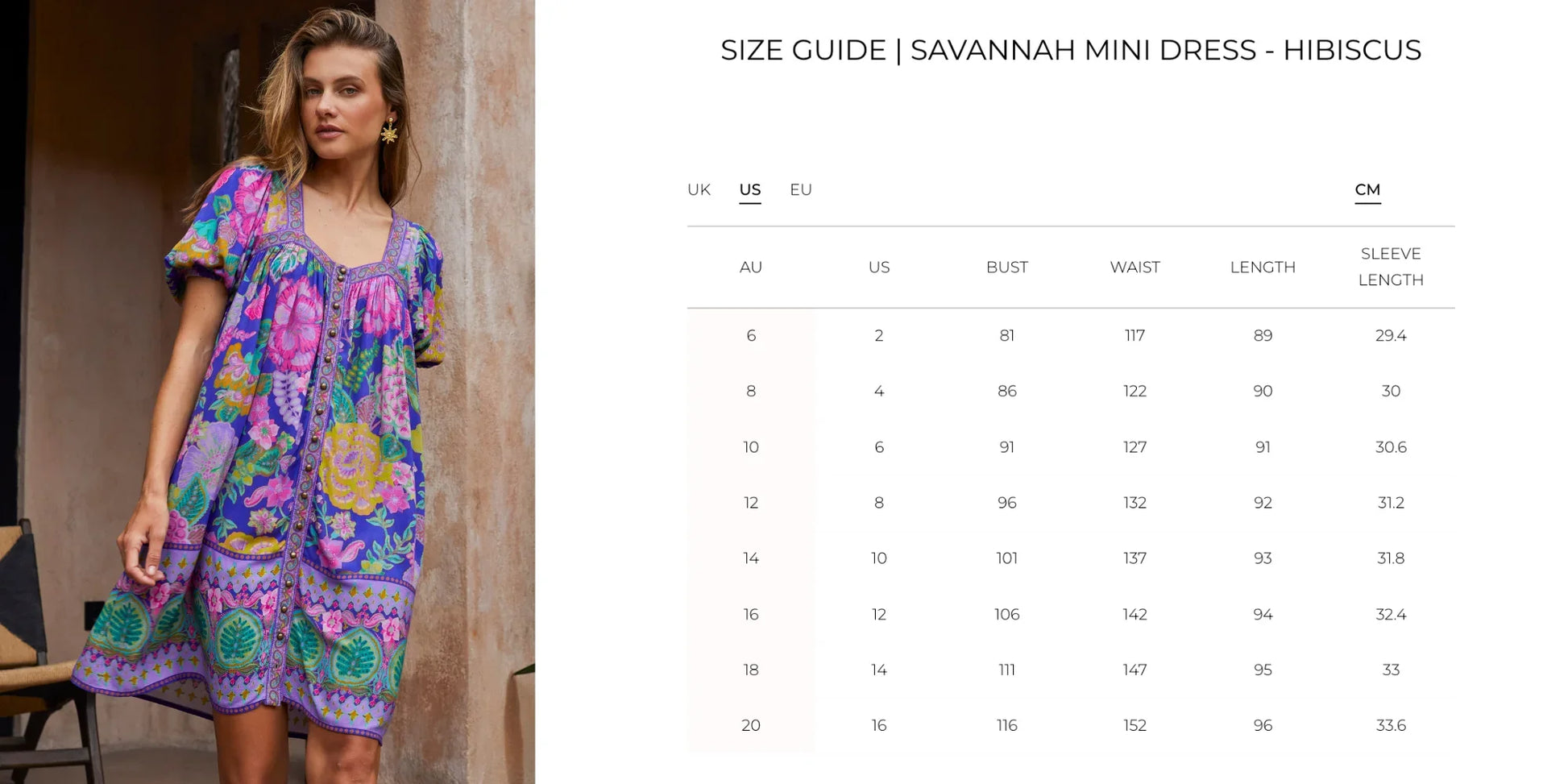 Models are 175cm tall and both are wearing a size AU 8