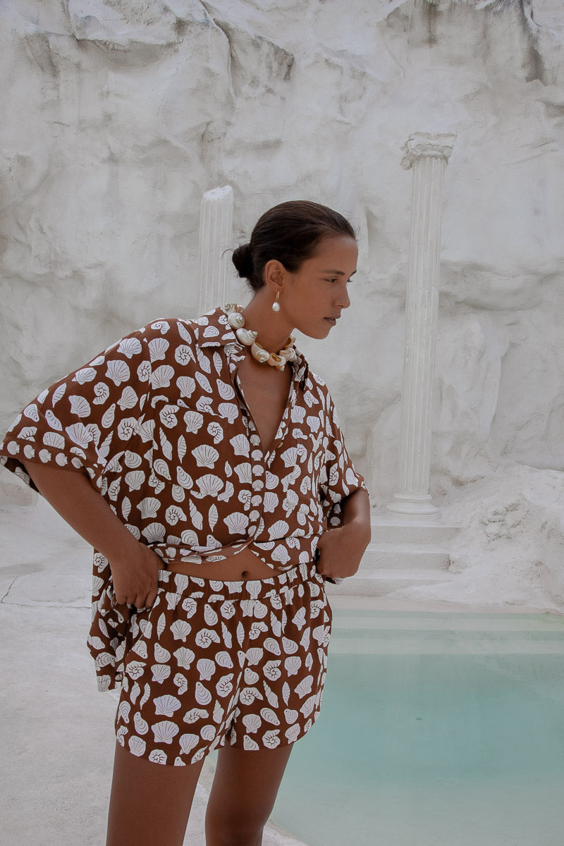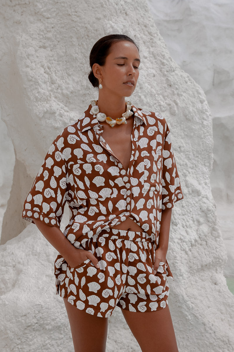 Our shell print 'Tide Pool' Shorts in a brown and off-white colourway. Made from 100% rayon in a low waist style that features an elastic waistband and fake fly with buttons. The shorts are a relaxed fit, with a 2cm side split. Style it with our matching Tide Pool Blouse to create a matching set. Exclusively by Palm Collective.