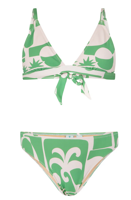 The Pacifica Tri Bikini brings a modern island feel to a timeless silhouette. Designed in our bold Pacifica geo-tropical print, this two-piece features a classic tri top with adjustable straps and a comfortable back tie closure for the perfect customized fit. The palm-toned green base adds a fresh, sun-ready vibe that feels right at home on any shore. Made from our buttery swim fabric and fully lined for comfort, this set is made for beach play, pool days, and warm summer adventures. Soft, secure, and easy to wear, it’s a staple for little explorers who love to move.