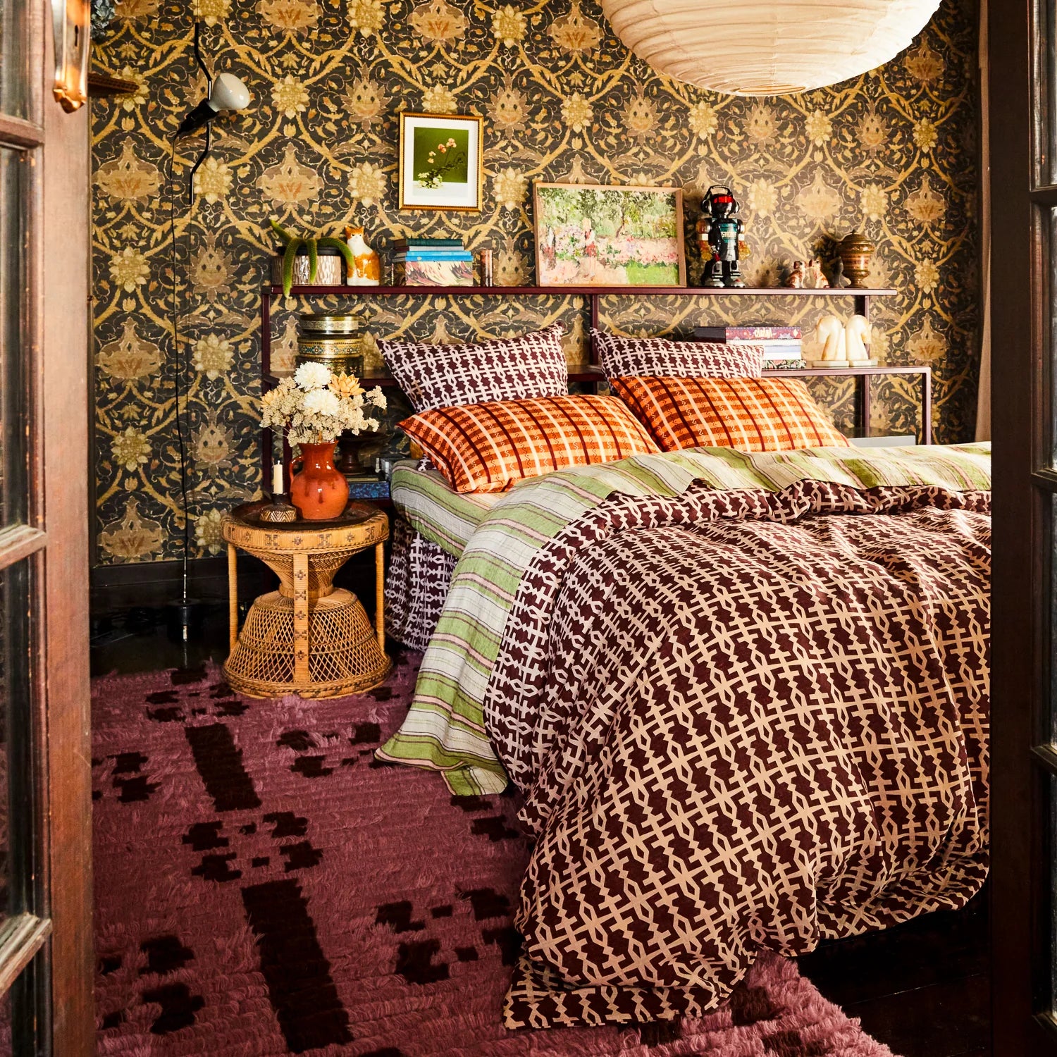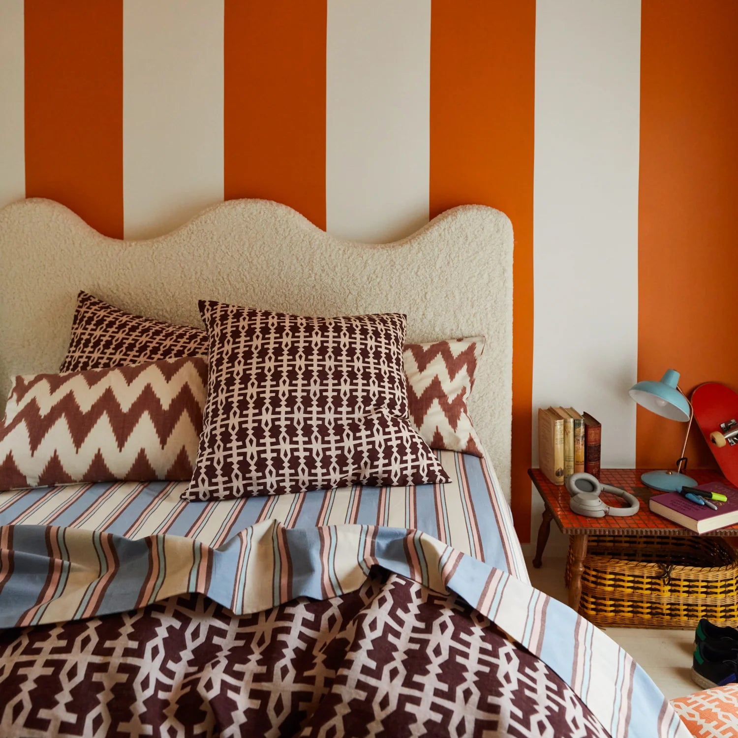 "Amata is inspired by the handcrafted, geometric designs of far-off lands. The symmetrical pattern and repetition of shape and colour emulate the stamping of pigment on fabric in traditional woodblock printing". – Phoebe’s Style Notes