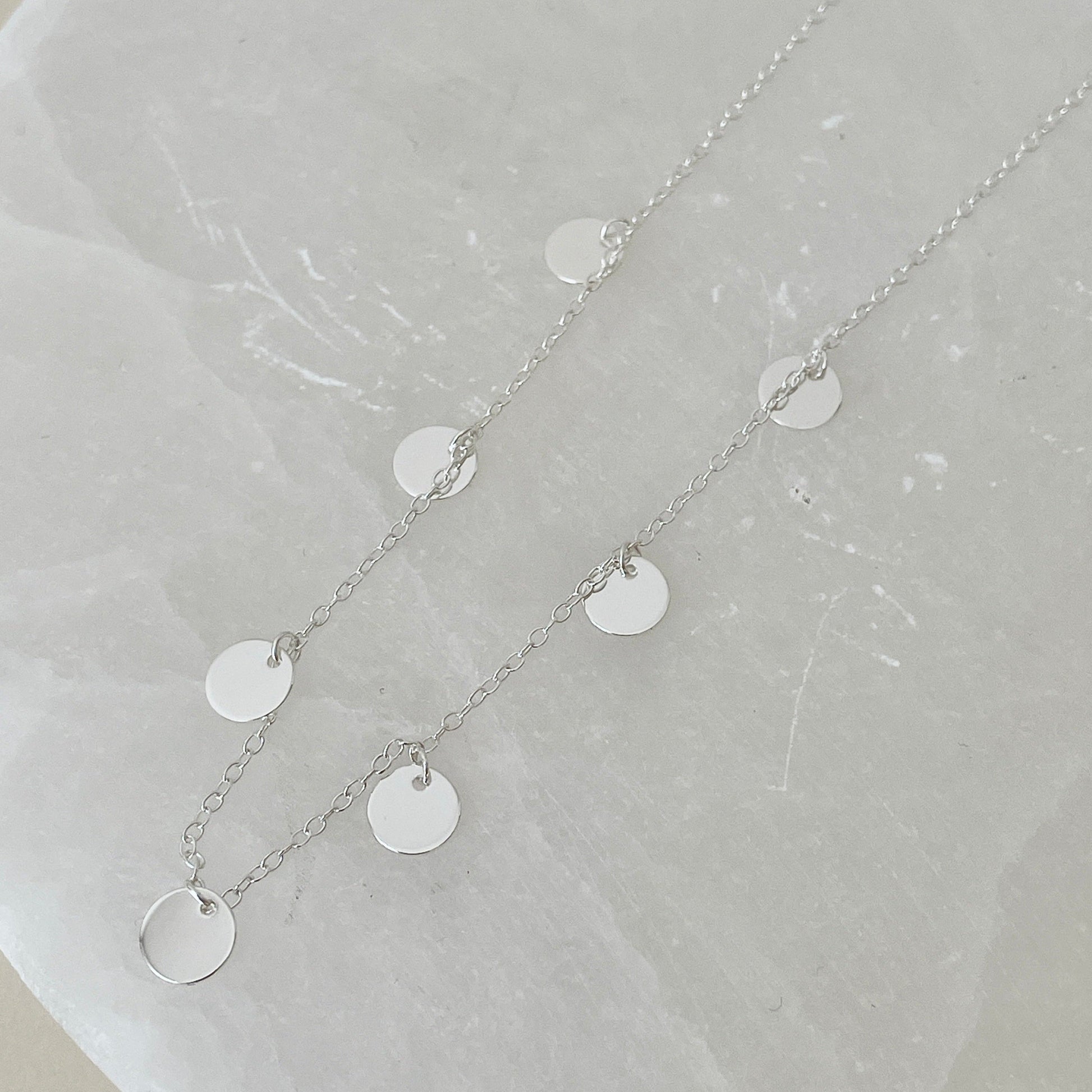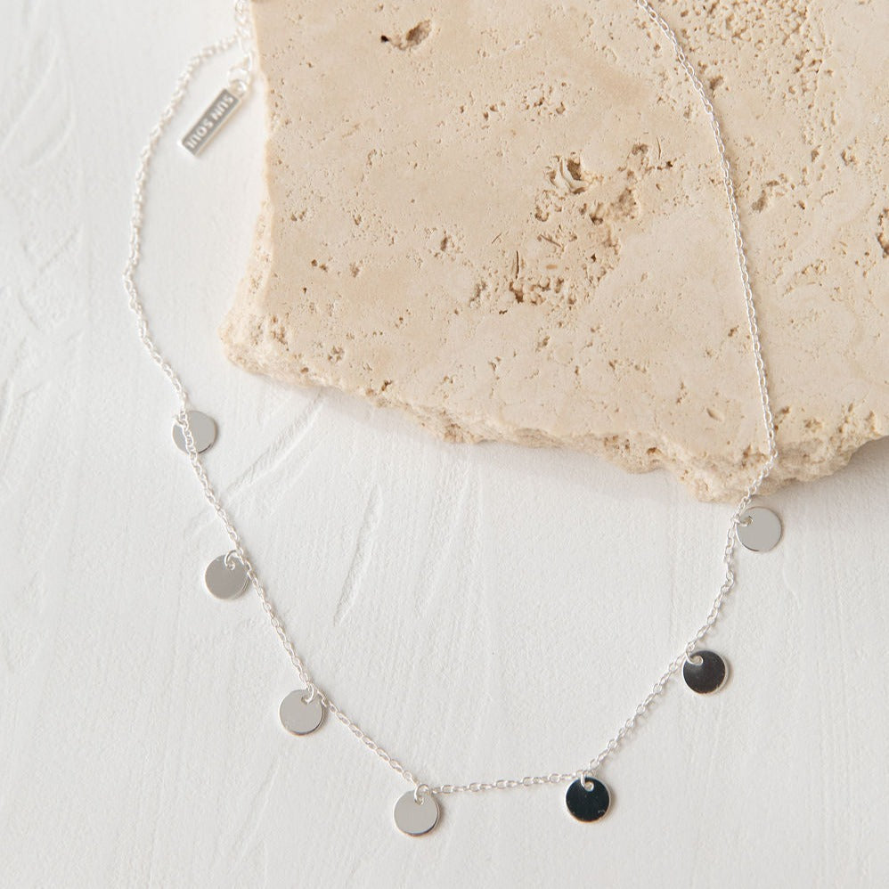 Made to be worn layered, this dainty choker necklace is adorned with seven golden discs.
