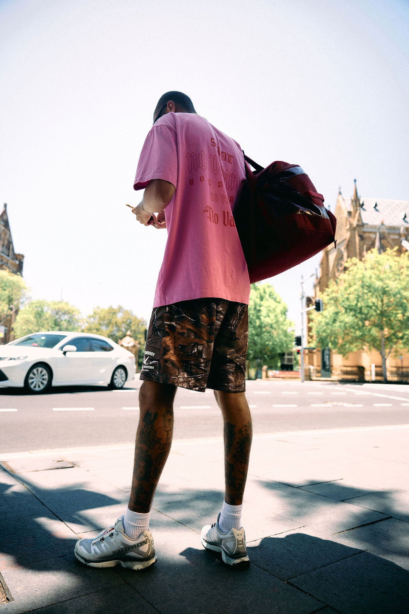 Introducing the No Vacancy Tee in Dark Pink Acid Wash. This unisex design features a bold SŚAINT logo on the front and a compilation of No Vacancy prints on the back - both in a contrasting lighter Grey tone. Inspired by our iconic No Vacancy fragrance - a scent made to turn heads and spark compliments, this tee exudes main character energy. Bold, stylish, and impossible to ignore.