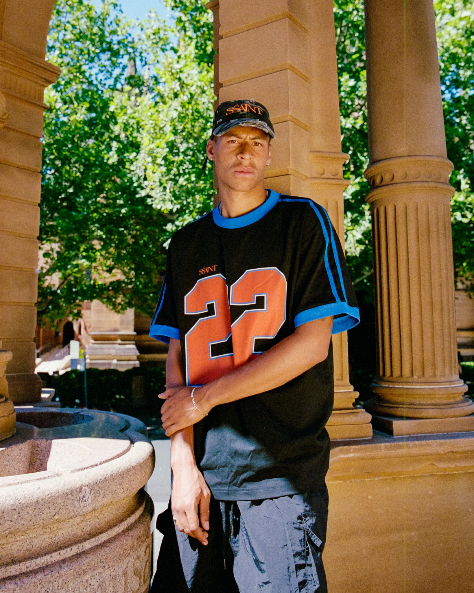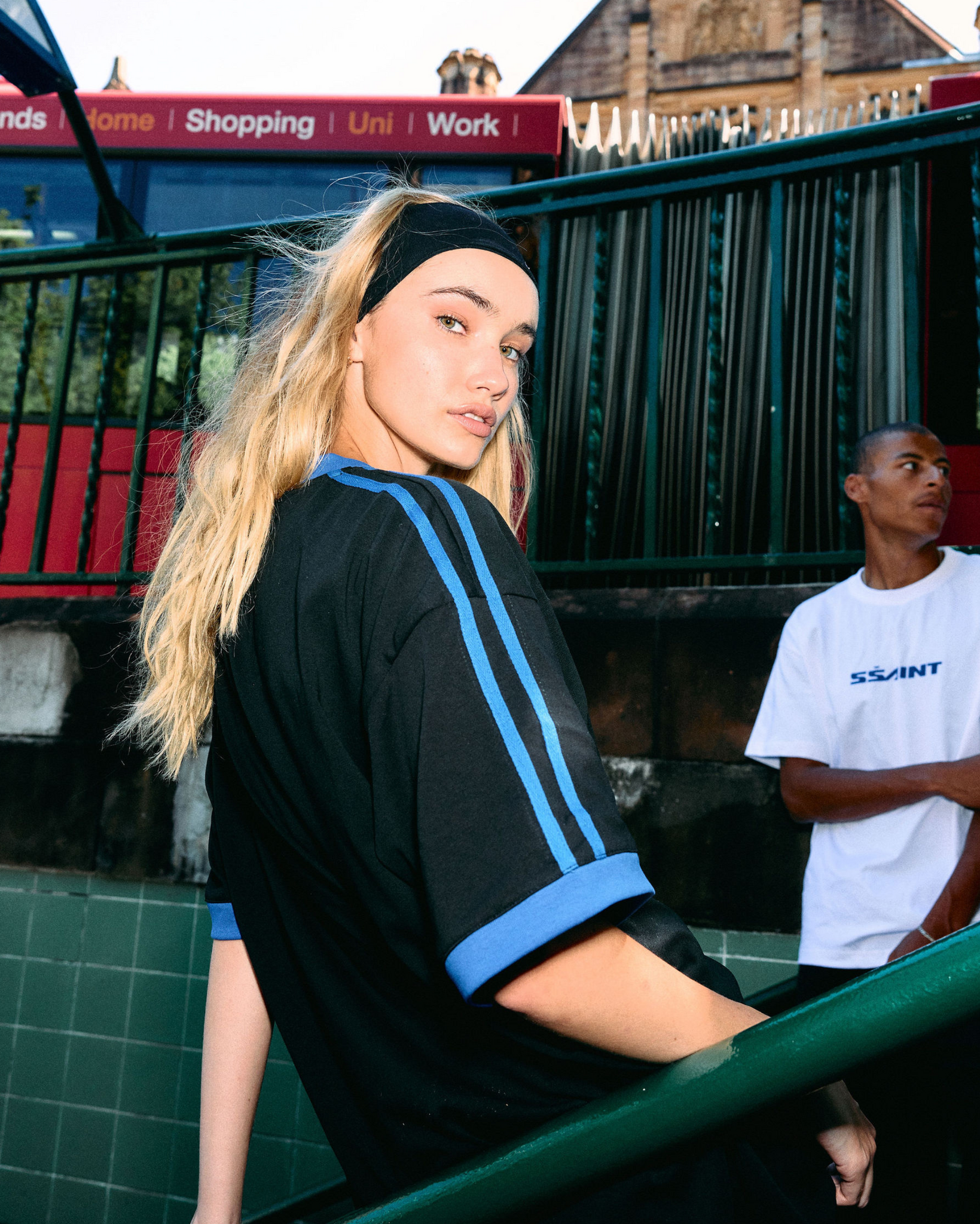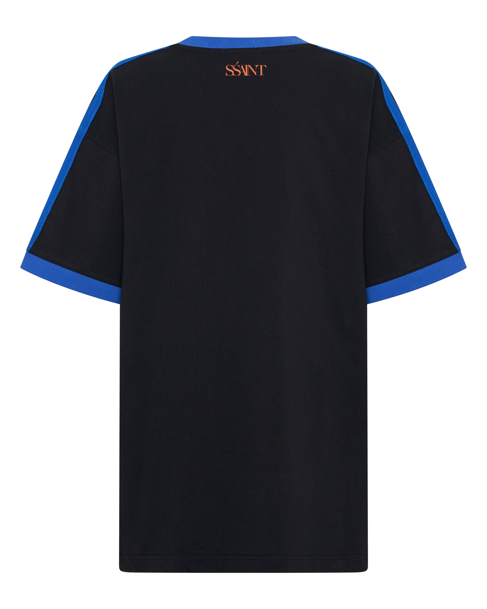 Gear up with the Twenty Two Tee, an oversized unisex design that pays tribute to our iconic Twenty Two fragrance. This bold black tee features striking orange 22 numbers on the front, complemented by blue stripes on the shoulders and sleeves for a football jersey-inspired look. Effortlessly cool and unmistakably stylish, this tee is your ultimate statement piece.
