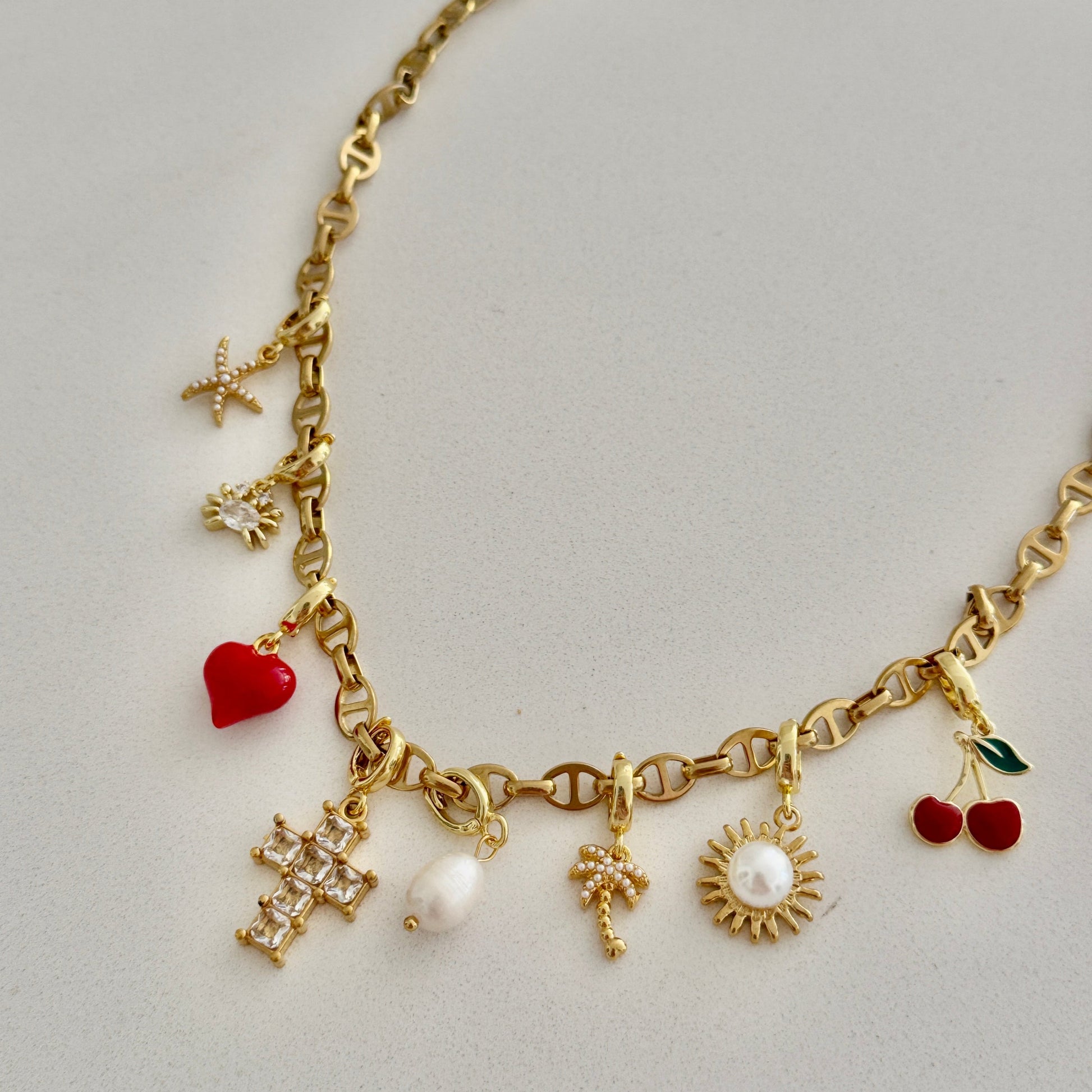 Inspired by the carefree spirit of the Gold Coast, the Faith, Love & Palm Trees Charm Necklace captures the essence of sun-drenched days, ocean breezes and life lived in full colour. This chunky stainless steel chain is adorned with a medley of vibrant charms and mementos, each one ready to be worn your way.
