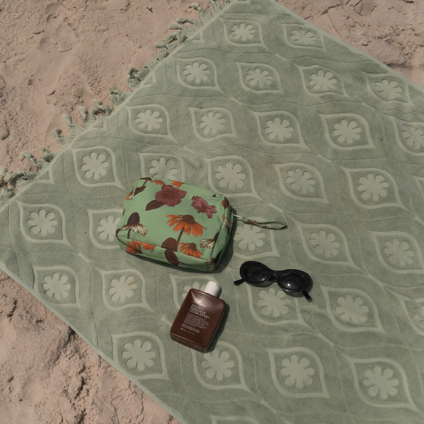 A new addition to our Beach collection this summer! This handy and versatile zip bag makes storing your sunscreen easy for a day at the beach. Pairs perfectly with the other pieces in the collection. Featuring our hand-drawn floral print and a large loop on zip end to make for easy caring.